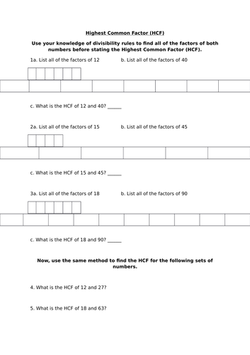 HCF - Highest Common Factor Math Worksheets|Printables PDF ... HCF worksheets for kids to practice HCF problems. The Highest Common Factor (H.C.F) of two (or more) numbers is the largest number that divides evenly into both numbers. In other words the H.C.F is the largest of all the common factors. The common factors or of 12 and 18 are 1, 2, 3 and 6.