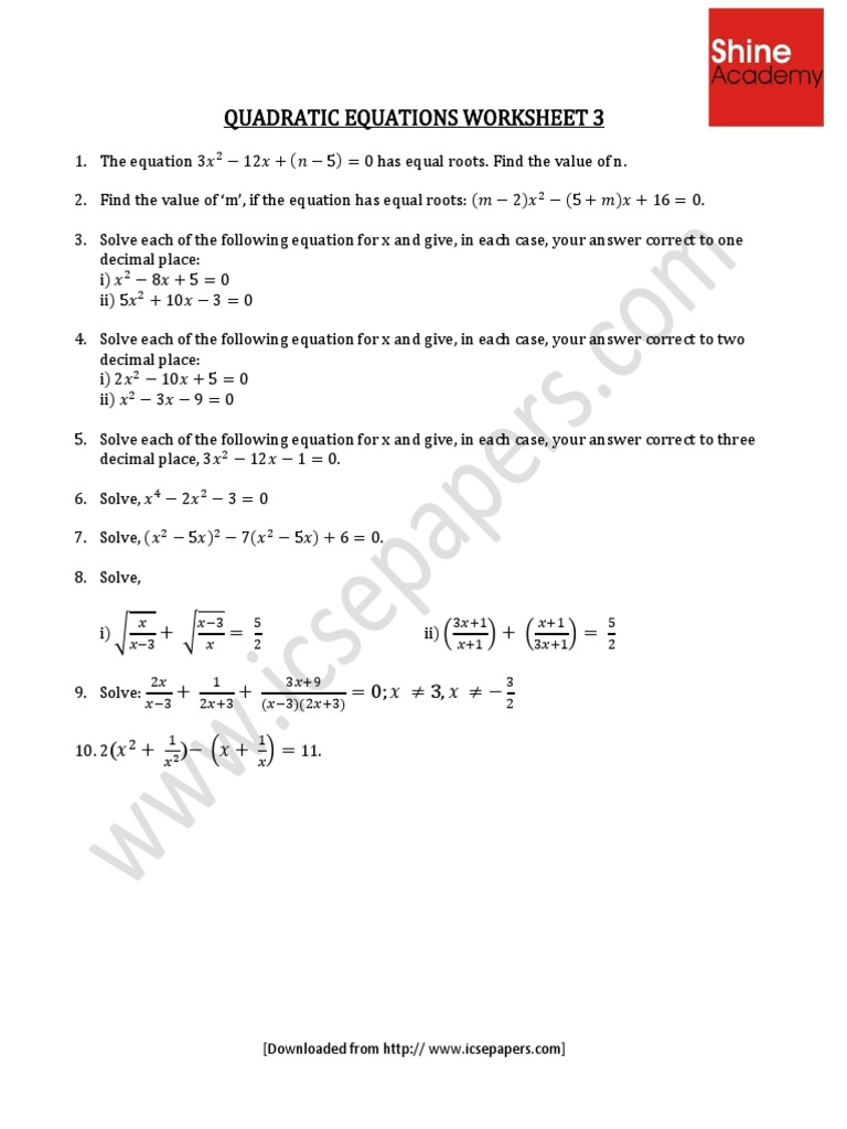 Class 10 Mathematics Quadratic Equation Worksheets Free printable worksheets for CBSE Class 10 Mathematics Quadratic Equation, school and class assignments, and practice test papers have been designed by our highly experienced class 10 faculty. You can free download CBSE NCERT printable worksheets for Mathematics Quadratic Equation Class 10 with solutions and answers.